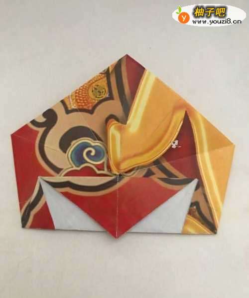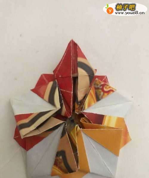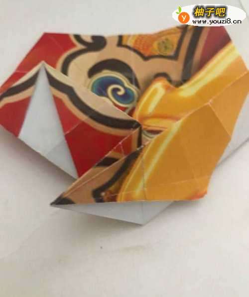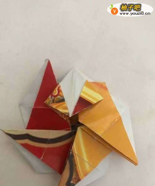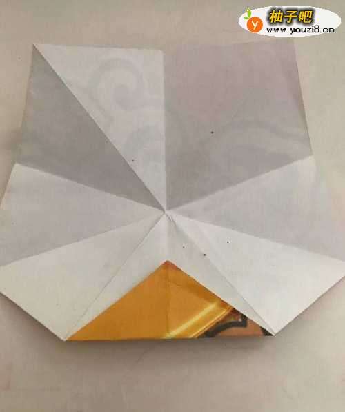 8第八步 五个角都按折痕折完之后 再把其中一个角扶起来劈开折倒 然后再把其它几个角同样扶起来从中间折倒压平