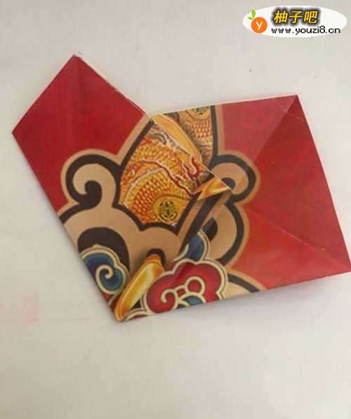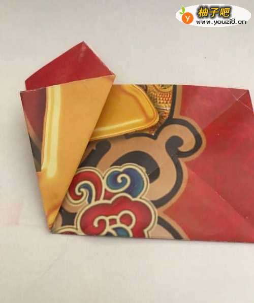 第一步 取一张边长为16厘米的正方形花色彩纸 先把它从下向上对边折叠 然后把右下角向上对齐折叠再取开 再把右上角向下对齐折叠