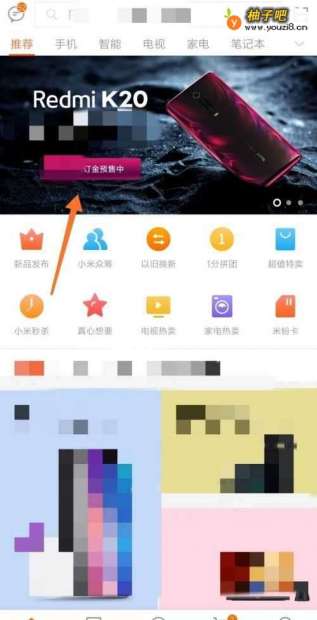 首先打开手机上的“小米商城”,主界面如下图所示,箭头处即可看到“Redmi K20旗舰新品”的预订入口。