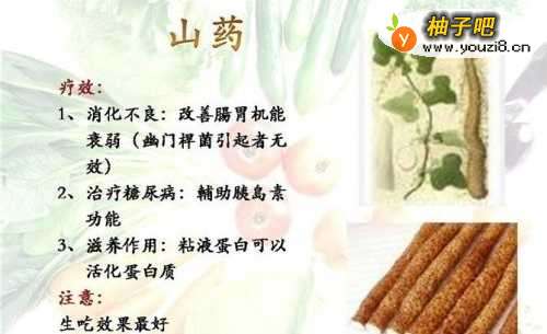 5山药中含有淀粉酶等多种营养物质,经常吃山药可以健脾养胃,有助于人体消化。糖尿病人可以吃山药,山药可以降低血糖,糖尿病人经常吃点山药,可以作为食疗的最好的蔬菜。