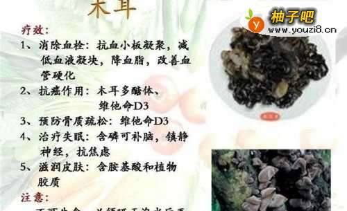 61. 木耳中铁的含量极为丰富,故常吃木耳能养血驻颜,令人肌肤红润,容光焕发,并可防治缺铁性贫血。