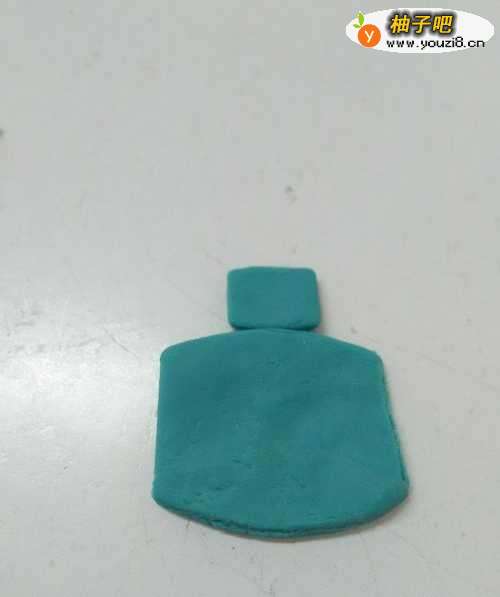 3再用一大块蓝色,捏一个大的长方形,然后把上下两条边捏圆一点,粘在瓶口下面,当作墨水瓶。