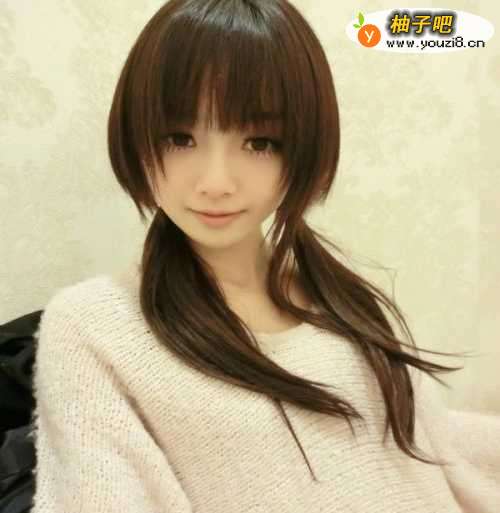 4两个辫子扎在接近耳后的位置,松松散散的落于肩上,齐刘海非常完美的遮住了脸型,上面和脸颊两边,任何脸型都可以试着尝试一下,应该会有非常惊喜的效果出现哦。
