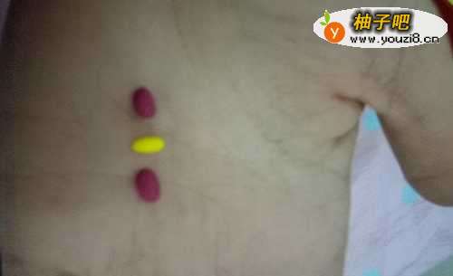 6取红色少量搓圆,以及黄色黏土少量搓椭圆,如下图所示摆放压扁,做企鹅蝴蝶结头饰