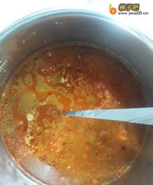 2接着把锅烧热,烧热后,将刚才准备好的火锅底料适量(重口味儿的朋友可以多加一点)的加入到锅中,待锅醒独言把火锅底料煎化、煎出香味儿后进入下一步