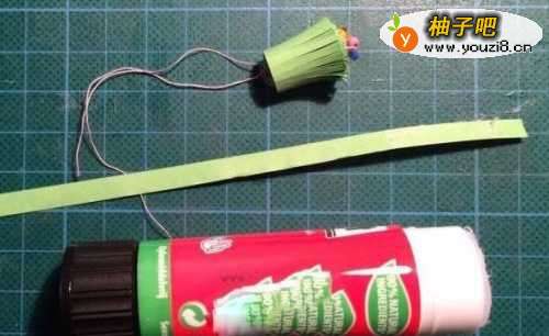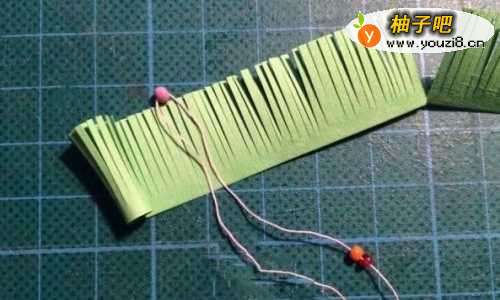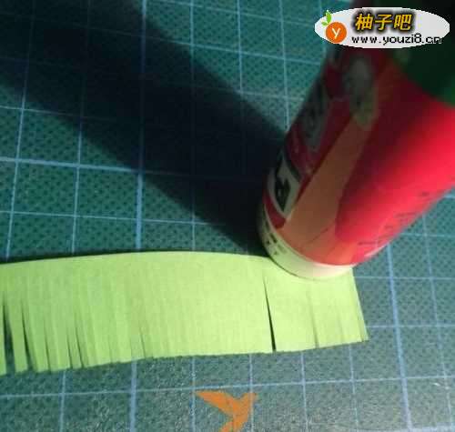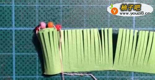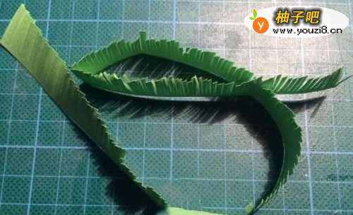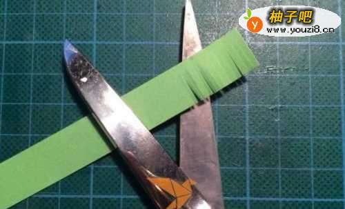 第1步:用宽的绿色衍纸纸条来将一边细细的剪一下