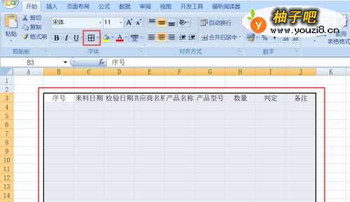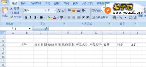 2之后我们选在在第三行,第二列来填写一些项目内容,为什么是第三行第二列是为了制作出来的表格更加好看一些,这个算是专业制作表格的一种常规操作了,我们输入:序号、来料日期、检验日期、供应商名称、产品名称、产品型号、数量、判定、备注,效果如图所示;