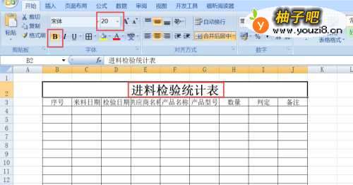 6之后我们在里面输入进料检验统计表,然后点击加粗,之后将字体设置为20;