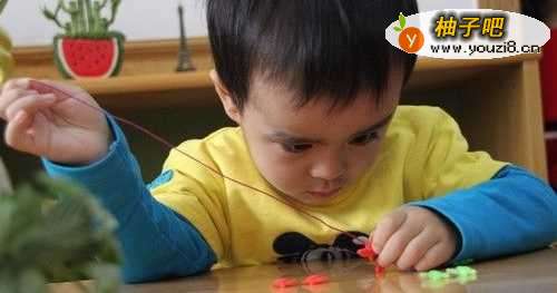 4串珠子。这是孩子很喜爱的一种活动,串的珠子越多越长,给孩子的成就感就越大,还可以矫正一些孩子的散光现象。