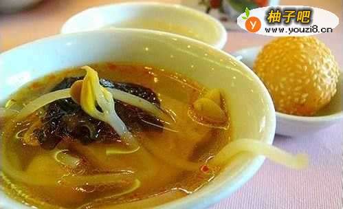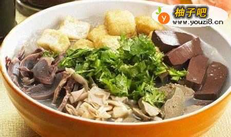 南京卖鸭血汤的摊子星罗棋布。精明的摊主预先将鸭血煮熟,切成小块放在锅中,见有游客来,便捞出鸭血装在白瓷碗里,然后浇上一勺滚烫的鲜汤,滴上数滴香油,撒上一撮虾米或鸭肠衣等,再加上一撮香菜。爱吃辣的客人,还可以再加上些辣椒油或胡椒,又香、又辣、可口的味。