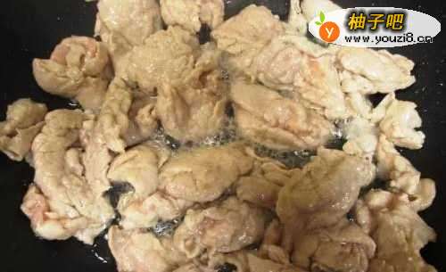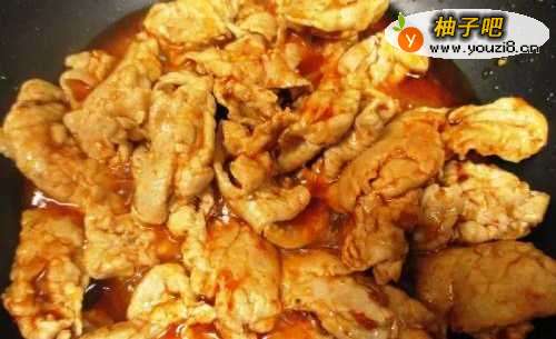 3加入豆瓣酱,炒出红油,裹上肉片。