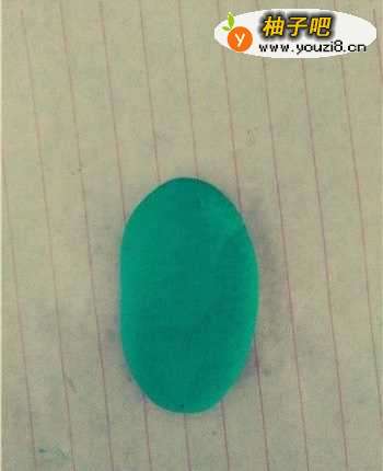 7取一块绿色粘土,将其搓成水滴状之后按压成饼状,黏贴在人物的头部,并用小刀将多余的部分去除,使其成为长方形状。