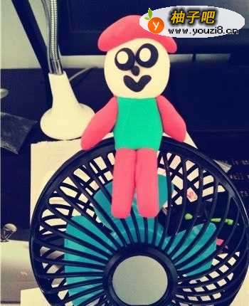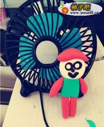 9这样一个简单又好看的粘土人物就做好了,把它和小风扇放在一起,更显的可爱与娇小了。