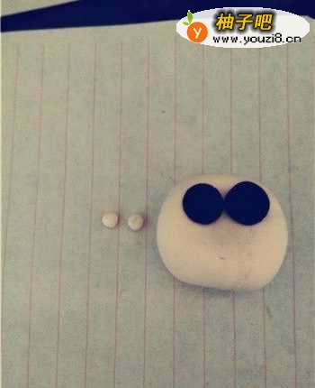 4将剩余的肉色粘土取出一点,并搓成两个大小相同的小圆球,之后粘在刚才做好的黑色圆球上面,并用自带的小刀轻轻的戳出眼球。