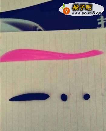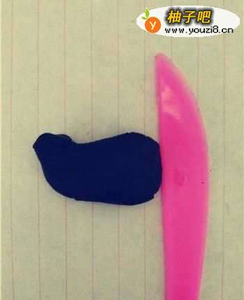 3将黑色粘土取出,在搓成长条状后用小刀切出两小点,之后粘在刚才做好的肉色粘土上面。
