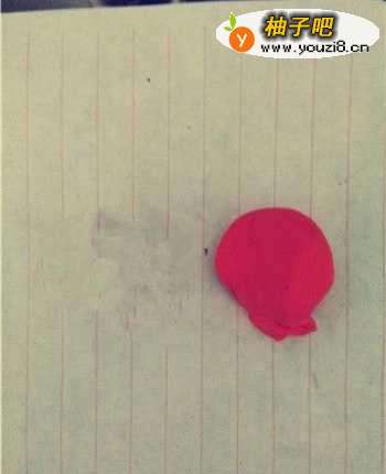 6取一块红色粘土,将其搓成圆球之后按成饼状,之后用自带的擀面杖轻轻戳几下,使其中间成为凹陷状,之后将该物体放置在肉色粘土的上方,用来当做人物的帽子。