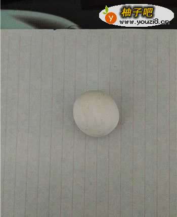 2将适量肉色粘土取出,并搓成圆球,之后用自带的擀面杖轻轻的按压一下,使其稍微呈现出凹陷状。