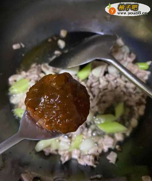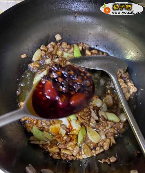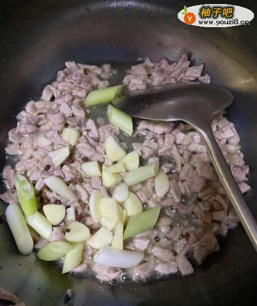 6肉颜色变白时将蒜末、花椒、葱段放进去爆香