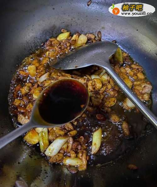 5把猪肉切成小丁,倒进锅里翻炒片刻