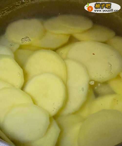 2锅里倒入适量水,水开后把土豆片倒进去煮半分钟,捞出控干水分