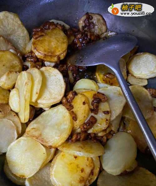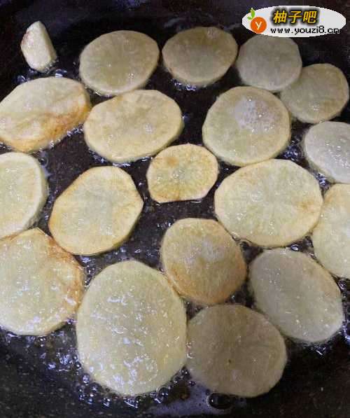 3锅里倒适量油,油热后把土豆片码放进去煎至微微焦黄