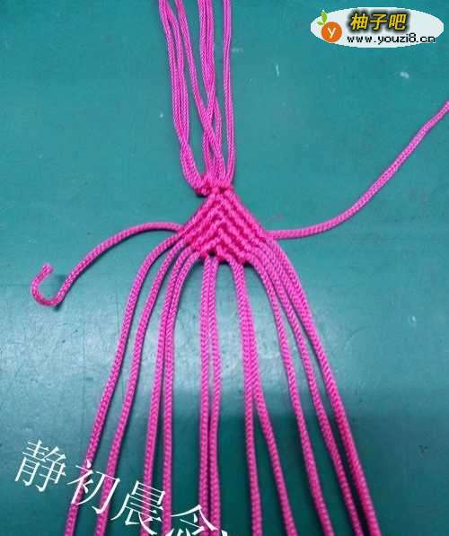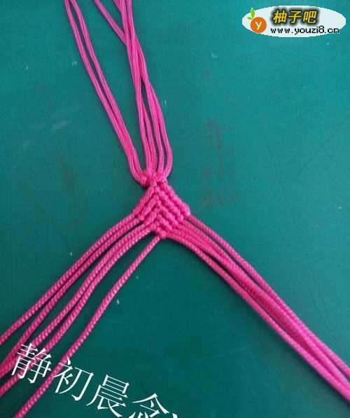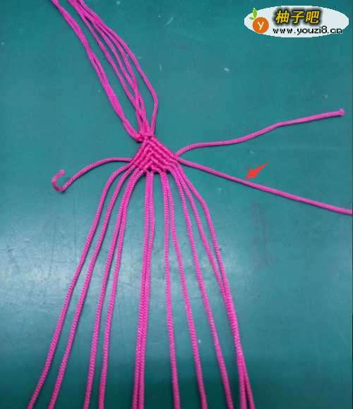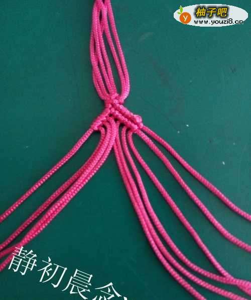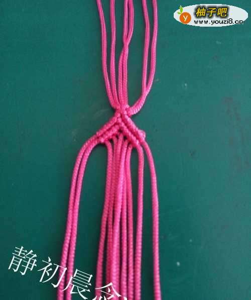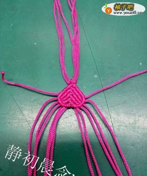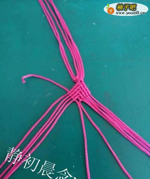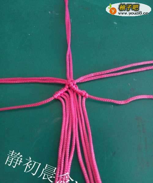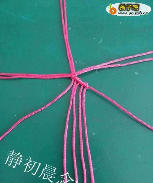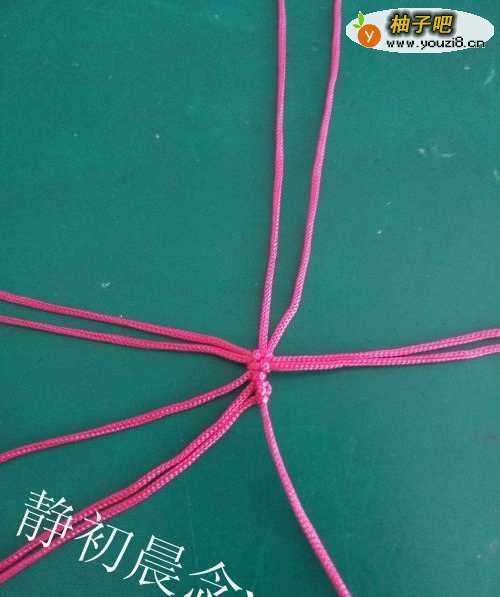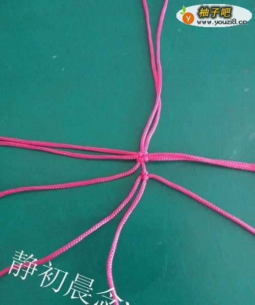 10现在,另取两根20cm左右的线,先取一根编左边,以左边的(最边的四根线)为轴线,另取的那根线编四个斜卷结