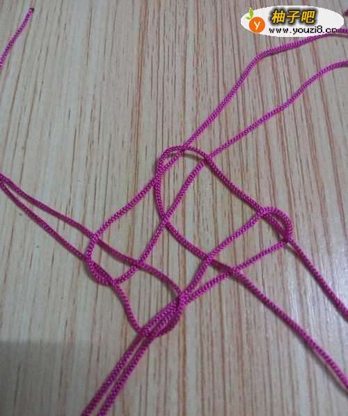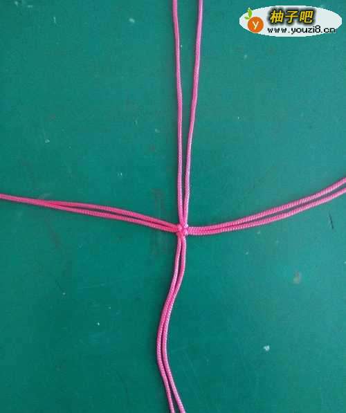 先准备长35cm左右的四根线,将每根线对折后,彼此做成套,,如图所示,要注意每根线的位置以及方向