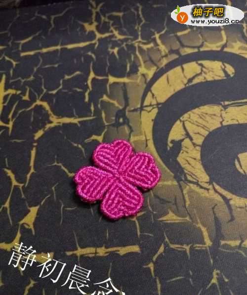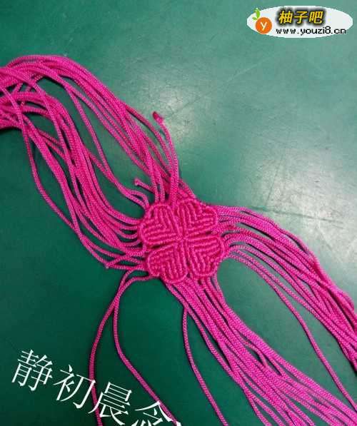 13再将左边的最边的那根线为轴线,按照右边的方法编斜卷结,最后将两根轴线也编一个斜卷结,编好后,如图所示,这就完成第一个了