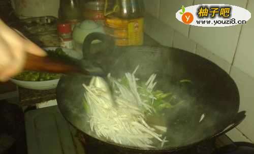 6在热锅中倒入适量的油,先将茭白丝和辣椒丝倒入锅中翻炒,加一些盐。