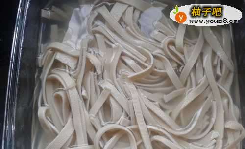 3把切好的百叶丝放入一个玻璃碗中(微波炉专用塑料碗也可,一定要可以放进微波炉里使用),加入热水,放入微波炉中加热2~3分钟,这样炒出来的百叶丝比较好吃~