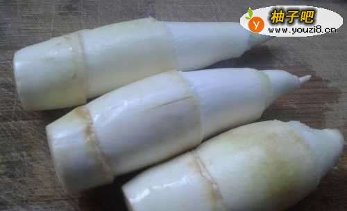 4将茭白的上面绿色的叶子部分剥去,切成丝,放入水中浸泡。