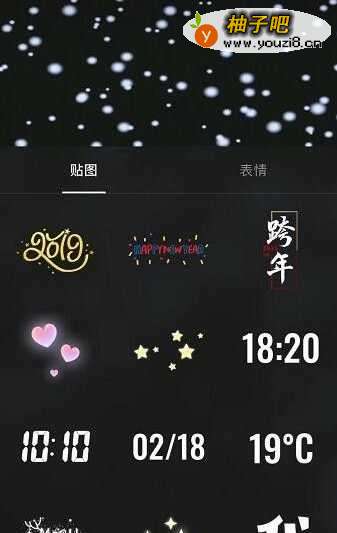 5打开贴纸之后,找打2019字样贴纸,放在拍摄页面上方,调整好大小,如下图
