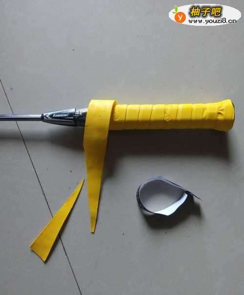 4第四步:缠绕到羽毛球拍柄顶部时用剪刀裁剪出斜边(这样粘合之后更美观)