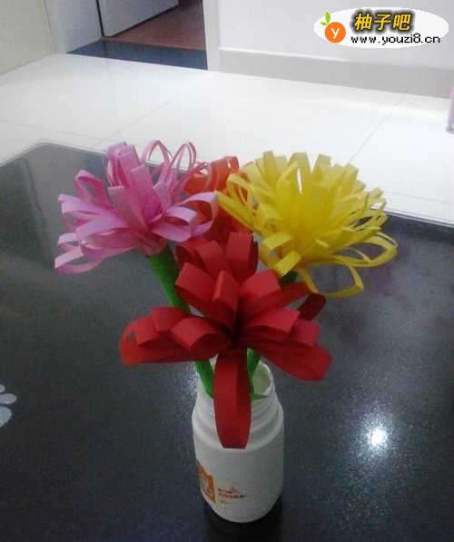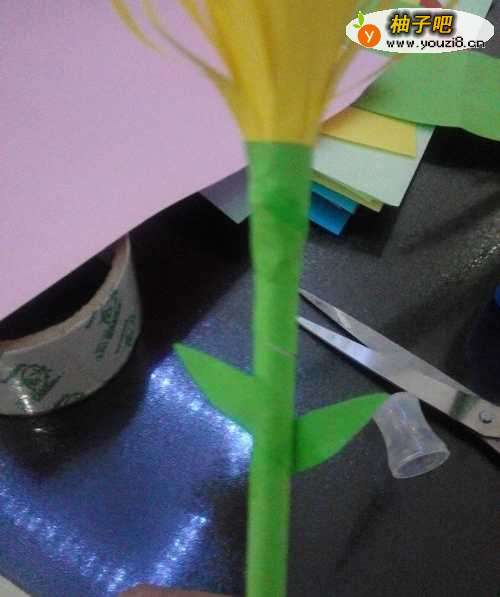 6用绿色彩纸建一个长条,卷在花的根部,作为花蒂。