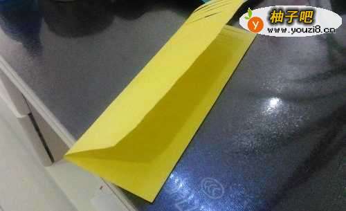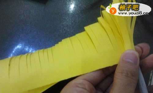 3再讲裁好的长方形纸对折,然后在折叠的这一边,剪成细条。注意不要剪到底,预留1.5CM左右。细条的尺寸根据纸张大小和铅笔粗细决定,不同尺寸做出的花造型有区别。