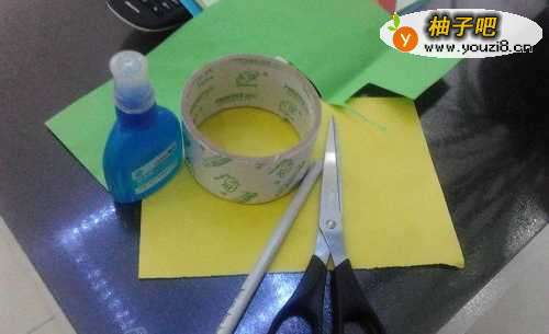 第一步,上材料全家福。彩纸,剪刀,透明胶带,胶水,铅笔。