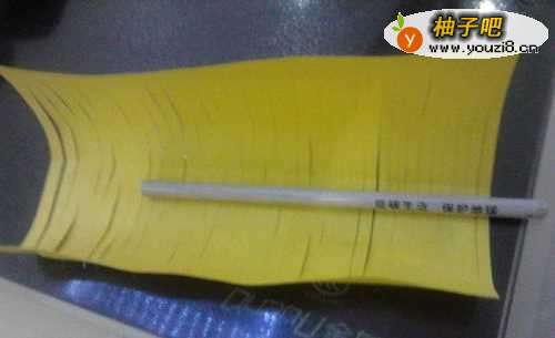 4剪好后打开彩纸,用笔杆压住,卷曲一下,否则最后花瓣太直,不美观。