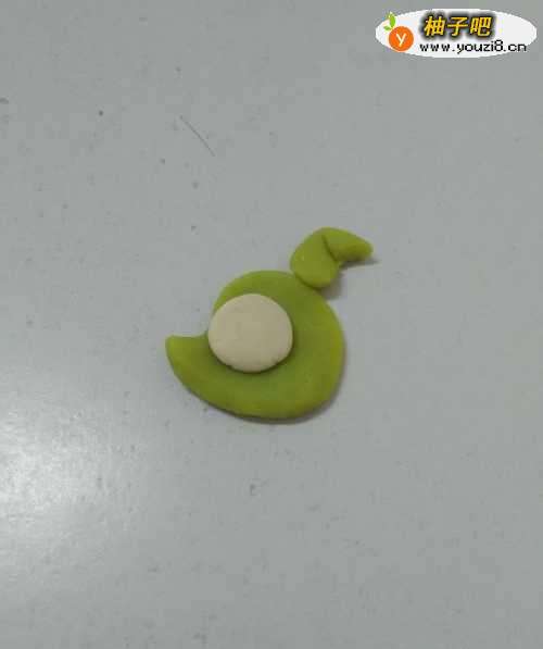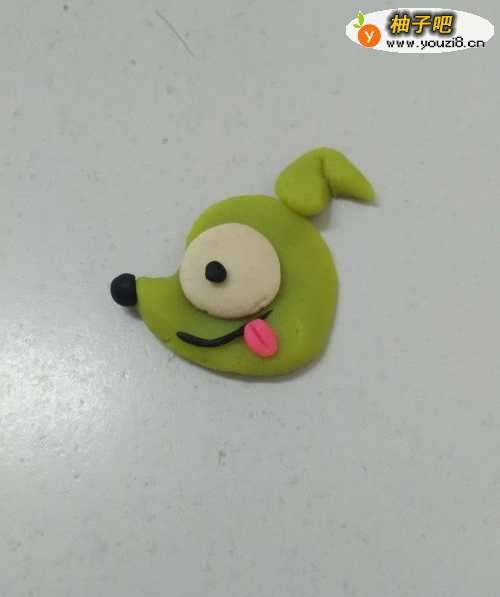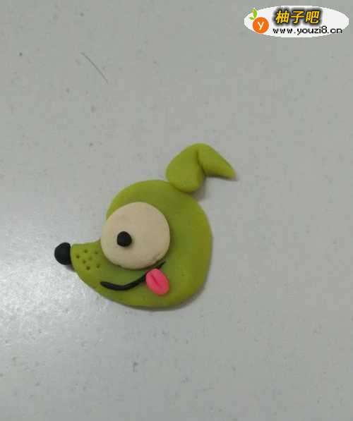 3再用一块黄绿色搓成圆条,按扁,从中间折一下,末端捏尖,粘在小狗的头顶,当作耳朵。