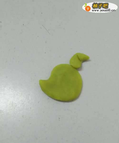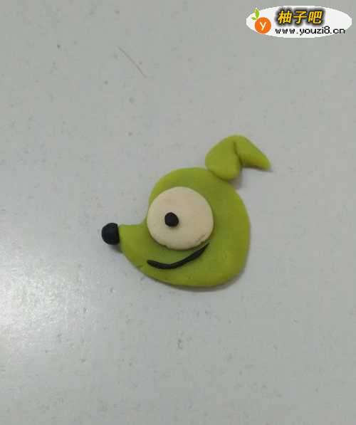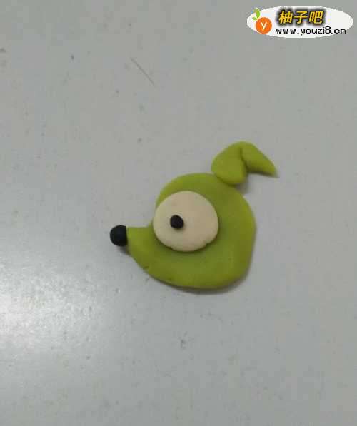 2先用黄绿色捏一个左边是尖的圆形,当作小狗的头,尖的地方是嘴。