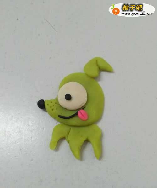10用黄绿色捏一个小方块,从小方块的下边捏出三个尖来,当作小狗的身体和腿,把身体和腿粘在小狗的头部下面。
