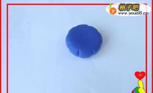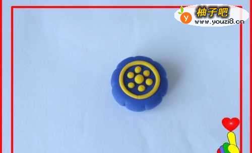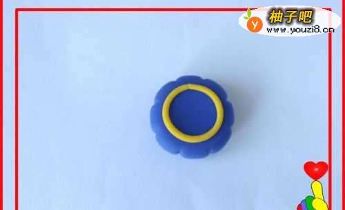 6最后,再取黄色彩泥适量,滚搓7个小圆球,粘合在圆环里面。