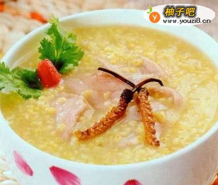 制法:猪肉切成细片,将鑫燕虫草与小米、猪肉用中火煲至水开,转为慢火煲约1-2小时,加盐调味食用。
