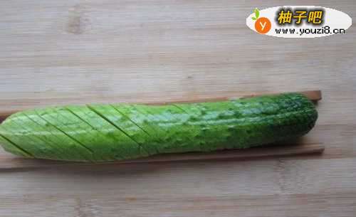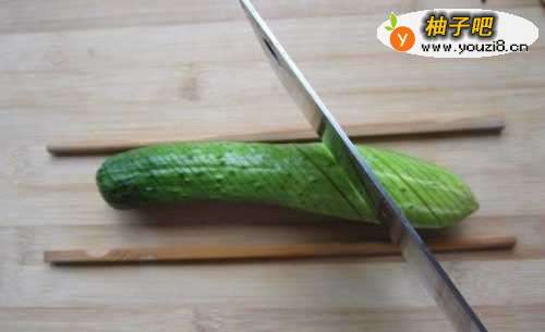 3黄瓜两边放2根筷子,刀刃与筷子呈45度角斜着下刀,切到筷子处即停