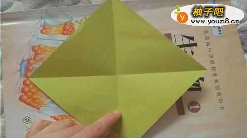 首先把彩纸的两角对折,如图一。再把上下角向内折,如图二。