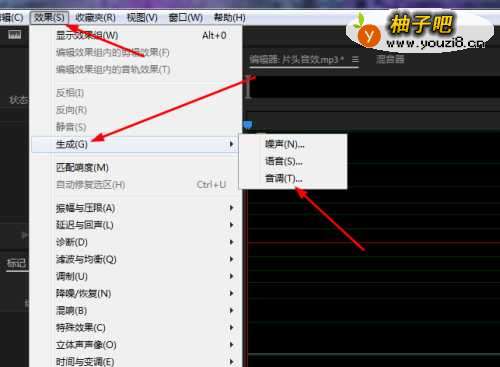 首先,我们点击菜单栏中的效果按钮,然后点击生成--音调。