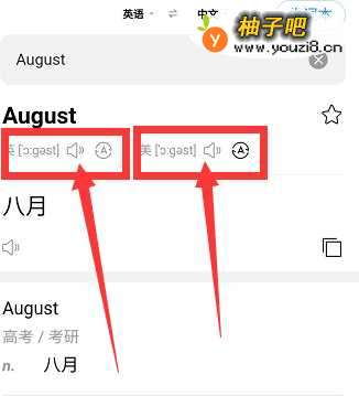5如果我们想要了解读音情况,可以自主选择英式或者美式英语的读音,点击音标后面的喇叭符号为单词读音,点击第二个符号为循环朗读。