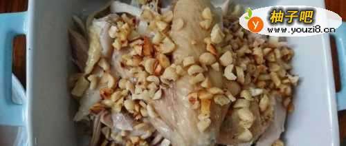6把花生碎,香菜和小米辣撒在鸡肉上。