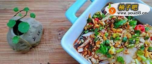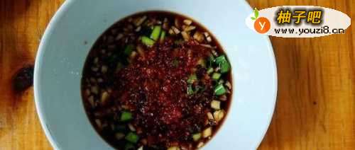7倒入调好的料汁,然后再倒入辣椒油和香油便可。