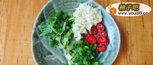 3把葱,蒜末,放在小碗里,并依次倒入配料表里的白砂糖,盐,香醋,生抽和辣椒粉。