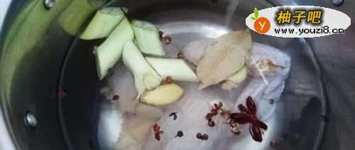 土鸡半只处理干净后,放入锅中,依次放入葱段,蒜头,生姜,花椒,八角,香叶,桂皮,倒适量料酒煮沸后,转中火煮12分钟,然后煮好后在锅中焖10分钟。
